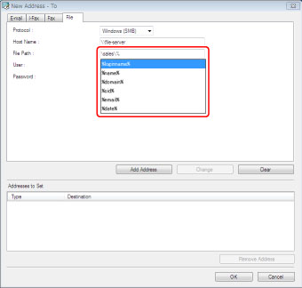 [IP 주소] 또는 [호스트명]을 선택하고 → 기기의 IP 주소(IPv4 또는 IPv6) 또는 호스트명을 입력합니다.