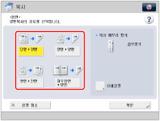 양면]을 사용하여 복사할 때 앞/뒤 페이지 양면을 선택한 경우 처음 양면 페이지의 앞면과 마지막 양면 페이지의 뒷면은 공 페이지가 됩니다. (기기 카운터는 공 페이지를 복사본으로 카운트하지 않습니다.)피니셔가 장착되어 있는 상태에서 무게가 60 g/m2 이하인 용지를 양면 인쇄에 사용하는 경우, 출력 용지가 정렬되지 않을 수 있습니다.