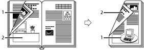 책이나 제본된 원고의 펼쳐진 페이지를 용지 한 장의 앞면 및 뒷면에 복사합니다.