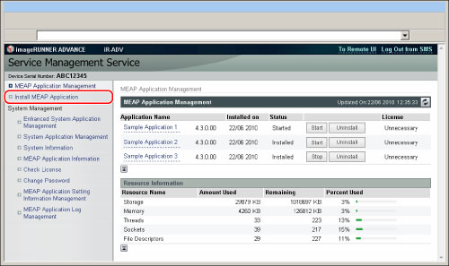 [MEAP Application Management] 페이지에 표시된 [Resource Information]의 [Storage]에서 MEAP 프로그램에 할당된 하드 디스크 공간을 확인할 수 있습니다.