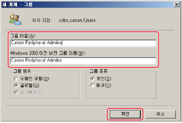 [새 개체 - 그룹] 대화 상자에서 그룹 이름을 입력하고 ('Canon Peripheral Admins') → [확인]을 누릅니다.