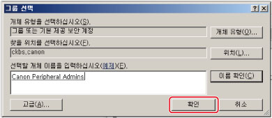 그룹 선택 대화 상자에 'Canon Peripheral Admins'를 입력하고 → [이름 확인]을 클릭합니다.
