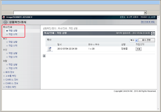 시스템 박스 또는 팩스 박스의 작업을 포함하여 로컬 인쇄 작업 이력을 표시합니다.