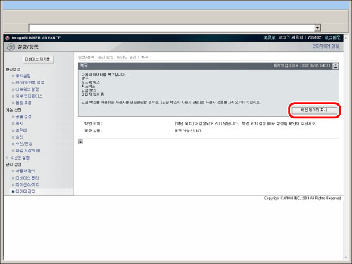 백업/로그 복원을 표시하려면 [설정/등록] → [데이터 관리] → [백업/복구 이력]을 클릭합니다.
