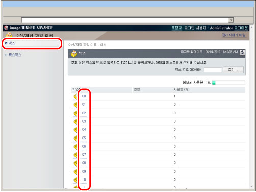 [수신/저장 파일 이용]을 클릭하고 → [박스]를 선택하고 → 원하는 박스의 이름을 클릭합니다.