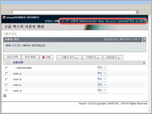 [User Access Control로부터 로그아웃]을 클릭하여 종료합니다. [User Access Control로부터 로그아웃]을 클릭하지 않고 웹 브라우저를 종료하면 로그아웃 프로세스가 정확하게 수행되지 않습니다. 이 경우 약 30분 동안 로그인 할 수 없다는 점에 유의하십시오.