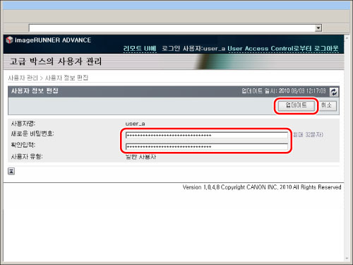 [새로운 비밀번호]와 [확인입력]에 새 비밀번호를 입력하고 → [업데이트]를 클릭합니다.