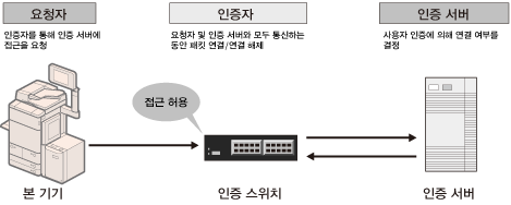 인증 서버(RADIUS: Remote Authentication Dial In User Service)를 통해 모든 인증 정보를 관리하고 요청자를 인증합니다. RADIUS 서버에서 인증된 요청자만 인증자에 의해 네트워크에 연결할 수 있는 권한을 가지고 있으므로 무단 액세스를 방지할 수 있습니다.