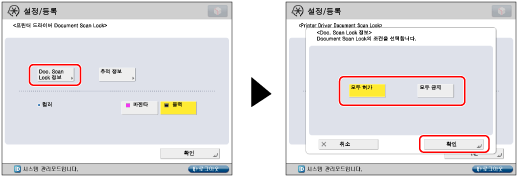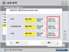 프린터 드라이버에서 각 작업에 Document Scan Lock 기능을 사용하려면 [인쇄 기본 설정] 대화 상자에서 [마무리]탭 클릭 → [고급 설정] → [장치의 보안 인쇄 기능]을 [설정]으로 지정합니다. 더 자세한 정보는 프린터 드라이버의 온라인 도움말을 참고하십시오.
