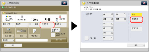 [스캔크기]를 누르고 → 스캔 크기를 선택합니다.