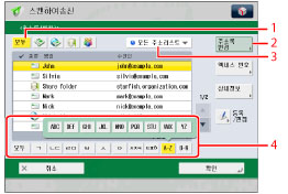 색인 키(예: [A-Z])를 눌러 각 문자 또는 숫자에 대한 개별 키를 표시하십시오. 문자 또는 숫자를 선택하여 표시되는 항목의 범위를 제한할 수 있습니다. 전체 주소 리스트로 되돌아가려면 [모두]를 누르십시오.
