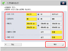 수신인의 기기가 컬러로 된 데이터를 수신하는 경우, [설정] → [다음화면]을 누르고 → 용지 크기와 해상도를 설정합니다. 수신인의 기기가 컬러로 된 데이터를 수신할 수 없는 경우, [해제]를 누르고 → 용지 크기, 압축 방식 및 해상도를 설정합니다. |