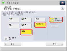 PDF 또는 XPS을 파일 형식으로 선택한 경우 [고압축] 및 [OCR (문자인식)]을 동시에 설정할 수 있습니다. 이 경우 스캔 및 송신 기본 기능 화면에 [PDF (고압축)] 또는 [XPS (고압축)]가 파일 형식으로 표시됩니다.