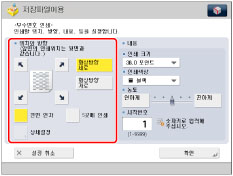 [부수인쇄 옵션]을 [부수번호 인쇄 옵션 설정]에서 '해제'로 설정한 경우 [전면 인자] 및 [5곳에 인쇄]가 회색으로 처리되고 선택할 수 없습니다. (See "부수 번호 인쇄 옵션.")