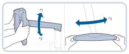 아래와 같이 각도를 조정할 수 있습니다. 아무 방향이든 조정 범위를 초과하면 조작 패널을 지지한 팔을 다칠 수 있습니다.