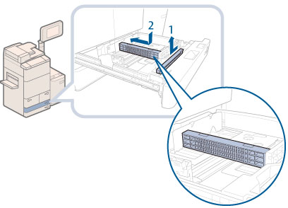 찰칵 소리를 내며 완전히 장착될 때까지 앞쪽 가이드를 밉니다. 앞쪽 가이드가 용지 카세트에 적재된 용지 크기에 맞도록 조정되지 않은 경우, 터치 패널 화면에 올바른 용지 크기가 표시되지 않을 수 있습니다.
