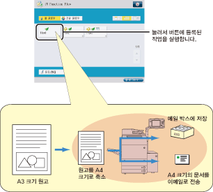 예를 들어 박스에 파일의 백업을 저장하는 동시에 A3 원고를 스캔하여 A4 크기로 축소한 다음 이메일을 통해 파일을 송신할 수 있습니다. 이 모든 작업이 플로우 버튼 하나를 누르면 수행됩니다.