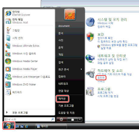 ] (시작) → [제어판] → [프린터]를 클릭합니다.