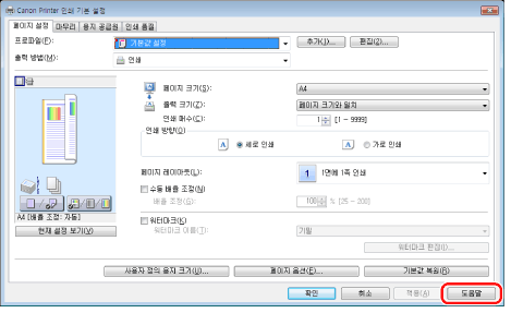 프린터 드라이버 화면에서 [도움말]을 클릭하여 온라인 도움말을 표시할 수 있습니다.