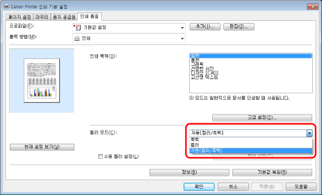 [자동[컬러/흑백]]는 데이터 종류에 따라 컬러 인쇄와 흑백 인쇄 간에 자동으로 전환합니다.