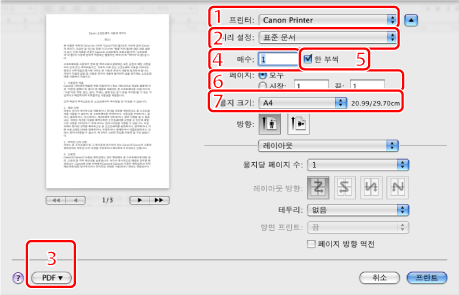 ]을 클릭합니다.[인쇄] 대화상자의 상단 부분에서 위의 기능을 설정할 수 없는 경우, [매수 & 페이지] 환경 설정 창이나 [페이지 설정] 대화상자에서 해당 기능을 표시하여 설정합니다.