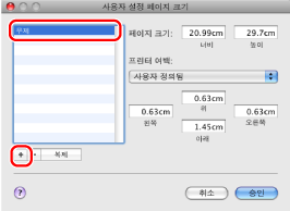 등록된 용지 크기를 삭제하려면 [사용자 정의 용지 크기]/[사용자 설정 페이지 크기] 대화 상자에 있는 목록에서 해당 크기를 선택하고 [-]를 클릭합니다.