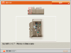 若發生卡針,觸控面板顯示螢幕上會出現指示卡針位置和如何清除卡針的螢幕。按照螢幕上的說明清除卡針。此螢幕將反覆顯示,直到清除卡針。若按[關閉],即使沒有立即取出卡針,也可以繼續執行設定模式或掃描原稿等操作。
