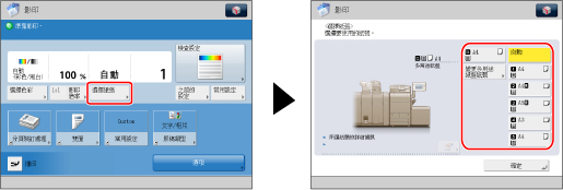 若預先將各個紙匣中要添加的紙張類型儲存到本機器中,則可以在紙張選擇螢幕上顯示指示各紙匣中添加的紙張類型的圖示。(請參閱「註冊/編輯自訂紙張類型」)