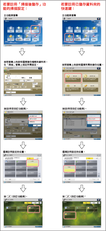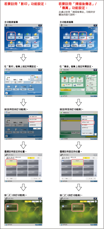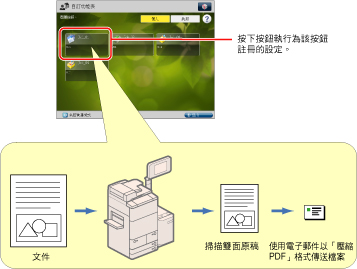 有關註冊「個人」按鈕/「共用」按鈕的說明,請參閱「註冊個人按鈕/共用按鈕」中以「掃描後傳送」功能為例的說明。