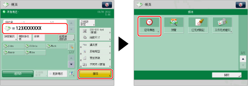 對於已指定預設傳送時間的文件,可以檢查其狀態、取消或變更其接收者。(請參閱「檢查和取消傳送工作」)
