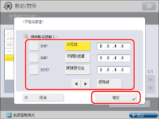 若在重新啟動本機器後不能透過DHCP、RARP或BOOTP獲得此資訊,則輸入[IP位址]、[子網路遮罩]和[閘道器位址]以使用該步驟中輸入的設定。