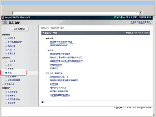 使用該功能前,必須從本機器控制面板在[常用設定]中註冊用於傳送檔案或電子郵件的設定組合。有關[常用設定]的詳細資訊,請參閱「掃描後傳送」。