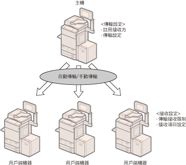 若<接收設定>的[接收裝置資訊限制]設定為「關閉」,本機器可以接收從其他型號機器傳輸的裝置資訊。(請參閱「設定接收機器」)但是,某些資訊可能無法正確傳輸。