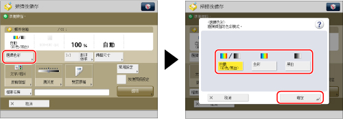 可以透過變更預設掃描設定,將所需的色彩模式註冊為預設設定。(請參閱「指定掃描後儲存設定」)