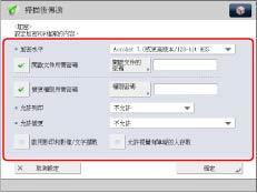 若選擇[Acrobat 6.0或更高版本/128-bit RC4]、[Acrobat 7.0或更高版本/128-bit AES]、[Acrobat 9.0或相當版本/256-bit AES]或[Acrobat 10.0或相當版本/256-bit AES],則顯示[啟用影印和影像/文字擷取]和[允許視覺有障礙的人存取],並可以分別設定這些設定。 |