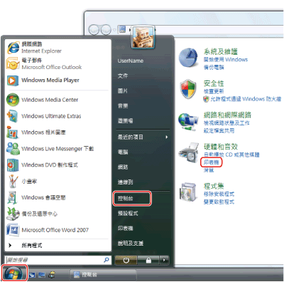 對於Windows XP Home Edition,按一下[開始]→[控制台]→[印表機和其他硬體]→[印表機和傳真]。