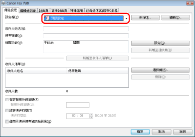 在[傳送設定]、[封面頁]以及[特殊選項]頁中選擇所需的設定檔。