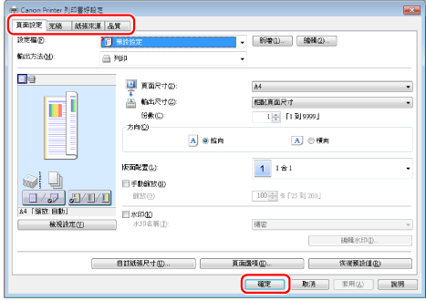 按一下[頁面設定]、[完稿]、[紙張來源]和[品質]頁,然後指定所需的項目。