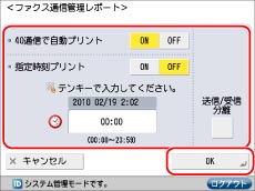 40件の文書を通信を終えた時点でレポートをプリントする場合は、[ON]を押します。