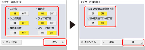 [メモリー送受信の正常終了音]と[メモリー送受信のエラー終了音]は、ファクス機能が使用できるときに設定できます。ファクス機能を使用するために必要なオプションについては、「各機能に必要なオプション」を参照してください。