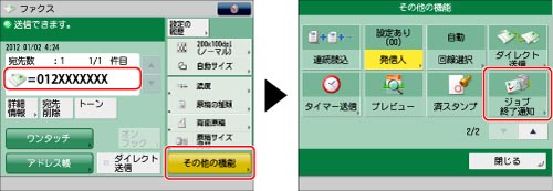 宛先を指定→[その他の機能]→[ジョブ終了通知]を押す