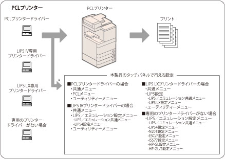 プリンターの種類によって、本製品のタッチパネルで行える設定は異なります。詳しくは下記を参照してください。