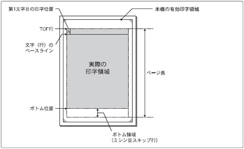 本エミュレーションモードでは、実際の用紙上での印字位置と印字領域について次の用語で説明しています。