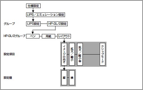 HP-GL/2エミュレーションモードの設定項目は、次の3種類のグループに分かれています。