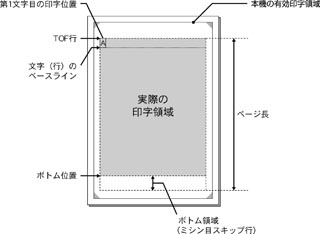 本エミュレーションモードでは、実際の用紙上での印字位置と印字領域について次の用語で説明しています。