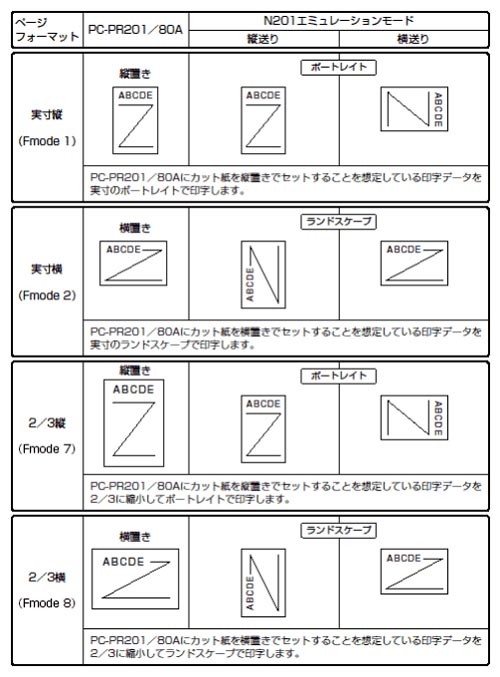 本エミュレーションモードの7種類のページフォーマットについて説明します。それぞれのページフォーマットでは、PC-PR201/80Aプリンターと同等の印字結果を得られるように、印字データの縮小方法や、印字領域などが決められています。