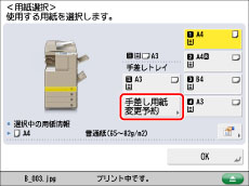 手差し用紙のデフォルト設定が登録されているときは、用紙のサイズ/種類をあらかじめ選択している画面が表示されます。(→手差し用紙のデフォルト設定を登録する)