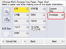 Set the envelope size to the same size as the envelopes loaded in the multi-purpose tray. Selecting paper or envelopes of a different size may cause a paper jam.