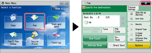 Four options shortcuts are displayed on the Fax Basic Features Screen. [Density], [Original Type], [2-Sided Original], and [Different Size Originals] are displayed as default. These shortcuts can be changed to functions that you frequently use.