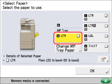 If paper is being fed from the multi-purpose tray for the current job, you can select the paper for the next job from [Change MP Tray Paper]. (See "Reserving a Print Job Using the Multi-Purpose Tray.")